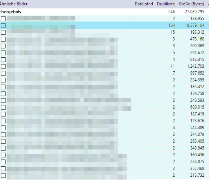 - Beim Ergebnis der Suche habe ich dann sehr sehr viele Gruppen mit 2 Duplikaten - Am Ende der Liste gibt es jedoch Gruppen mit deutlich mehr Duplikaten je Gruppe, innerhalb dieser Gruppe sind verschiedenste Bilder enthalten. Und ab diesem Punkt setzt es bei mir aus