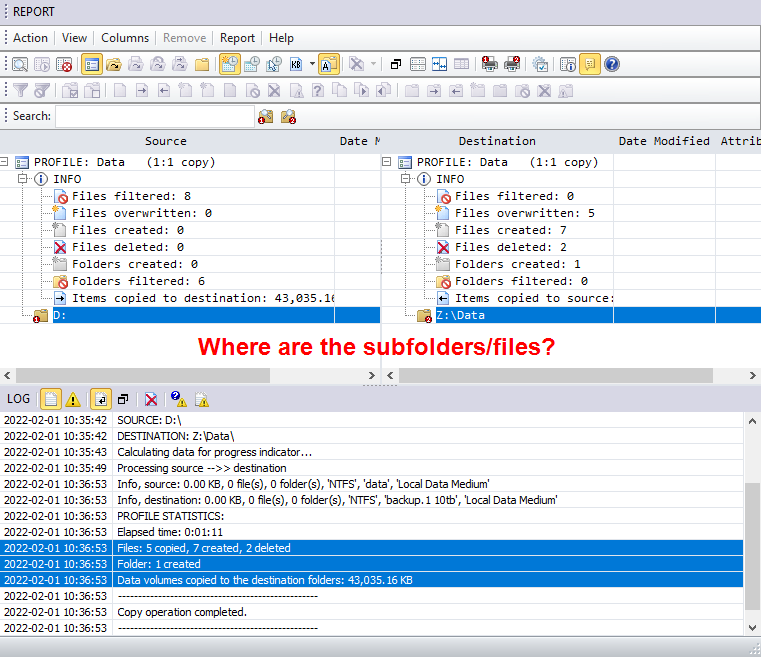 Here's a screen shot of the report - notice there are no subfolders/files in source/destination panes: