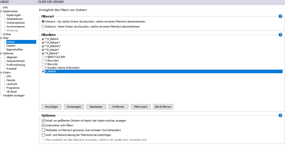 Kein Ordnerfilter und nur ein inklusiver Dateifilter: *\4_Elektrik\*