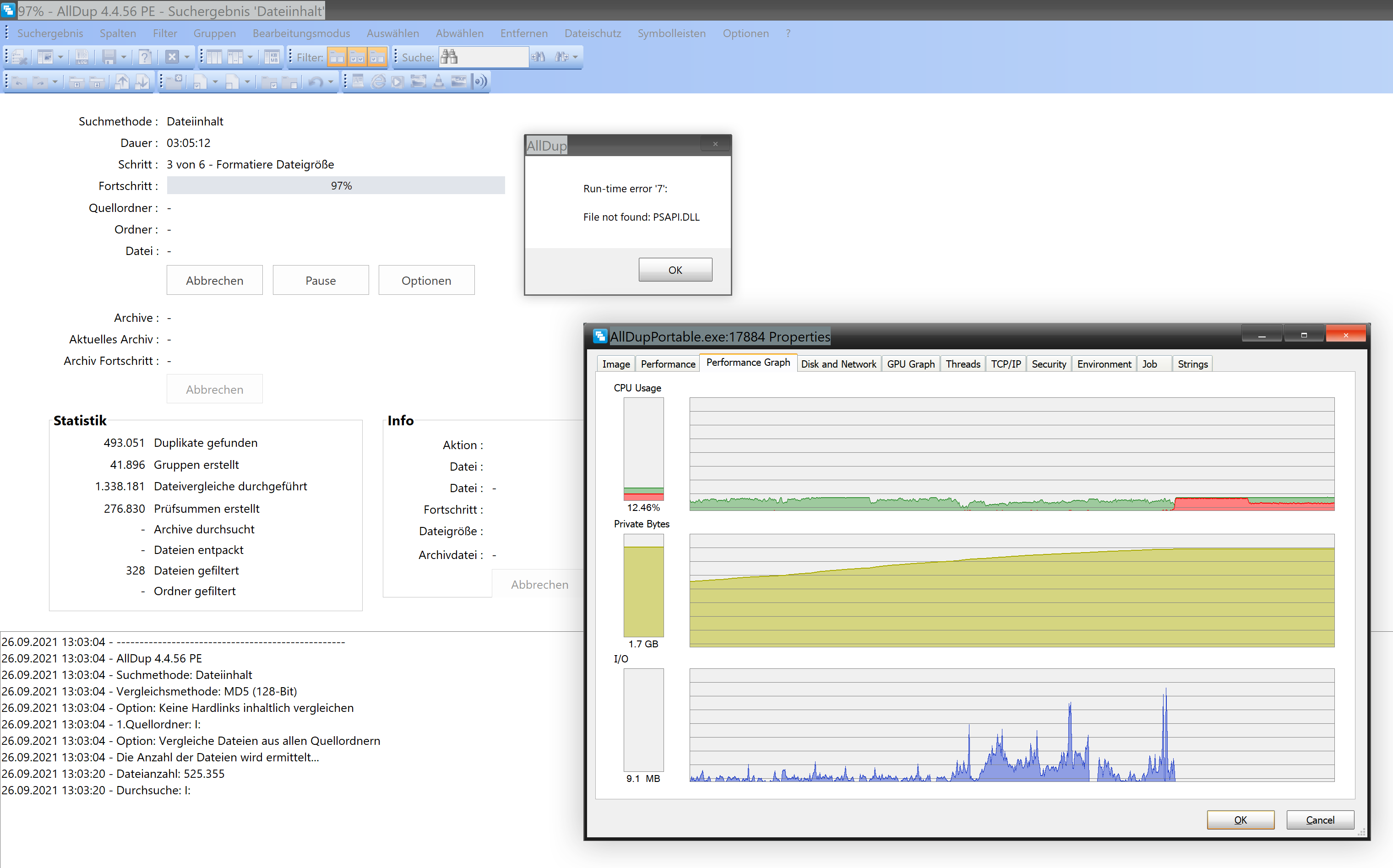 Neuer Versuch, diesmal Abbruch bei 97% mit Error PSAPI.dll, bei 1,7 GB Speichernutzung: