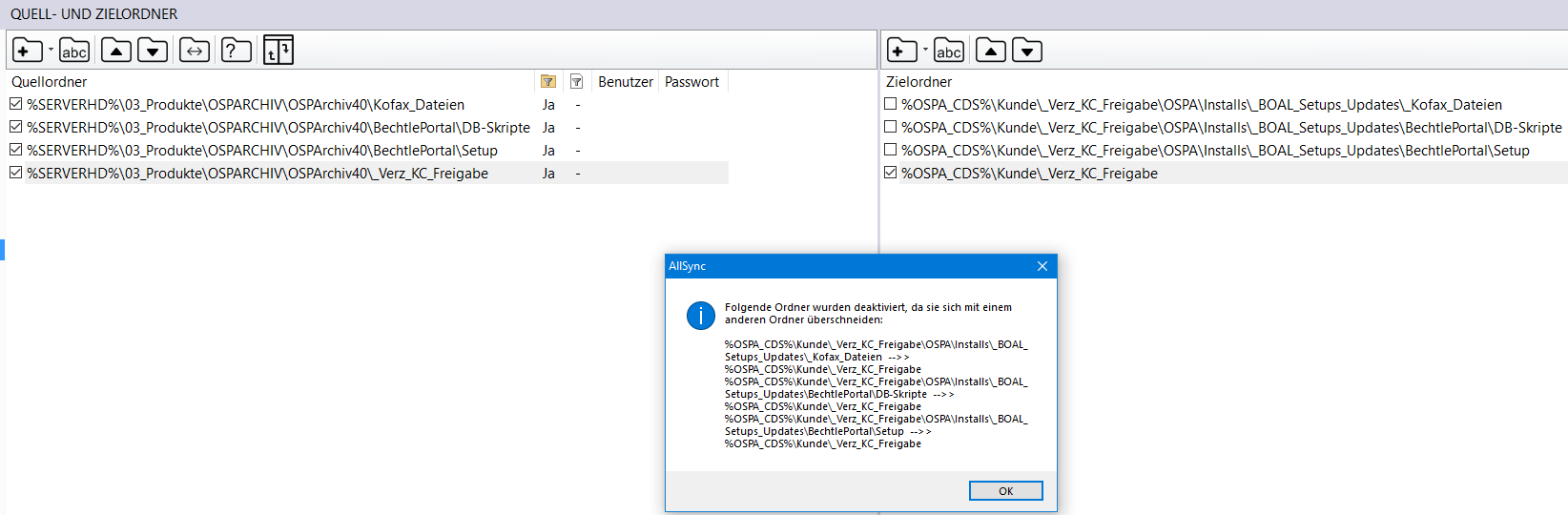 Ich kann Ihnen anbieten, eine neuen Option für die Quell- und Zielordnerliste zu implementieren, mit welcher die Überprüfung der Ordnerüberschneidung deaktiviert werden kann.