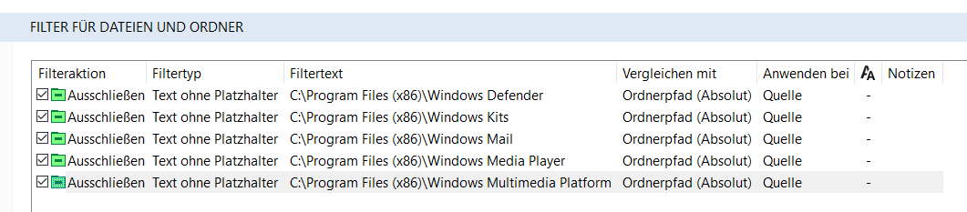 Danke. Ich finde Ihr Programm sehr gut. Jedoch bei der neueren Version die Filterregeln (unterschiede) sind meiner Ansicht nach nicht gerade verständlich (Filter nach Name, absolute, relative Pfad, Text mit, ohne Platzhalter, RegEx…).