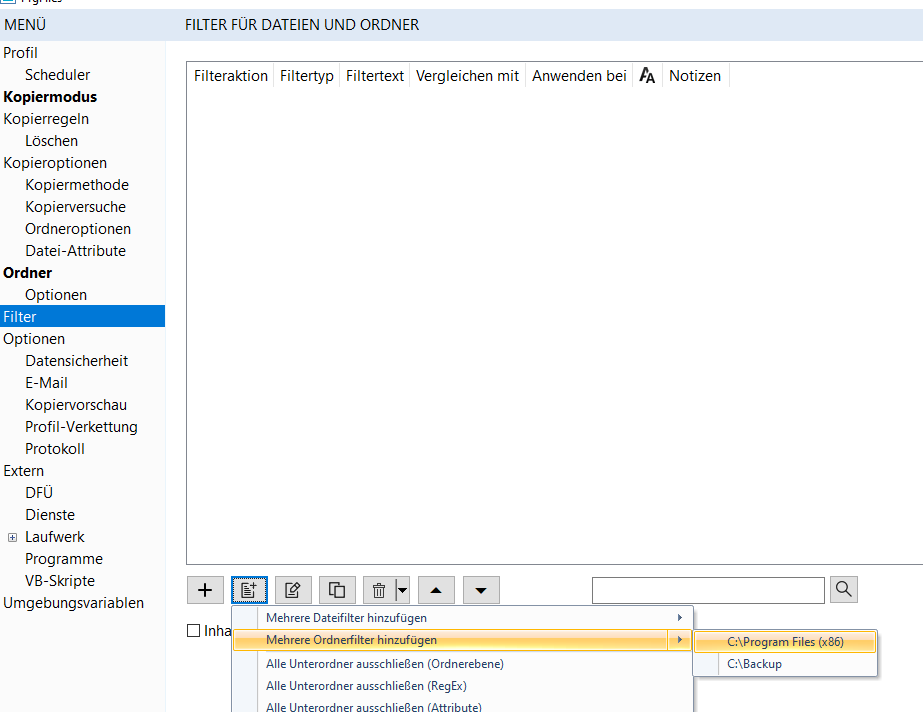 Sie können in den Profileigenschaften bei den Filtereinstellungen ganz einfach mehrere Ordner wie folgend filtern:
