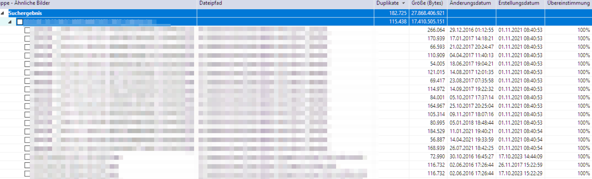 - Beim Ergebnis der Suche habe ich dann sehr sehr viele Gruppen mit 2 Duplikaten - Am Ende der Liste gibt es jedoch Gruppen mit deutlich mehr Duplikaten je Gruppe, innerhalb dieser Gruppe sind verschiedenste Bilder enthalten. Und ab diesem Punkt setzt es bei mir aus