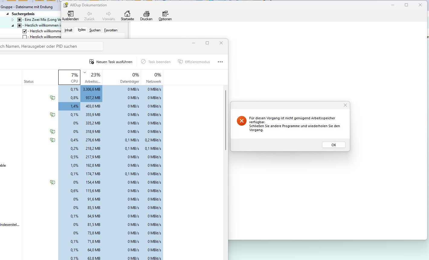 Der Arbeitsspeicher war aber nur zu 23 % belegt und davon nur 3.306,6. MB von AllDup also es ist noch viel Arbeitsspeicher vorhanden. Die Hilfe zeigt entweder nichts an oder hat auch mal ausgegeben, nicht genügend Arbeitsspeicher, obwohl noch 76 % frei sind.