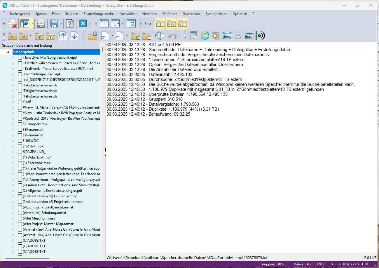AllDup ist eine 32-Bit-Applikation und Windows erlaubt nur die Nutzung von 2 GB für 32-Bit-Applikationen. Durch bestimmte Tweaks kann die Nutzung auf 3-4 GB erweitert werden. Wenn das Suchergebnis den maximal möglichen Speicher ausnutzt, dann können die unterschiedlichsten Fehlermeldungen auftreten und AllDup reagiert dann nicht mehr korrekt.