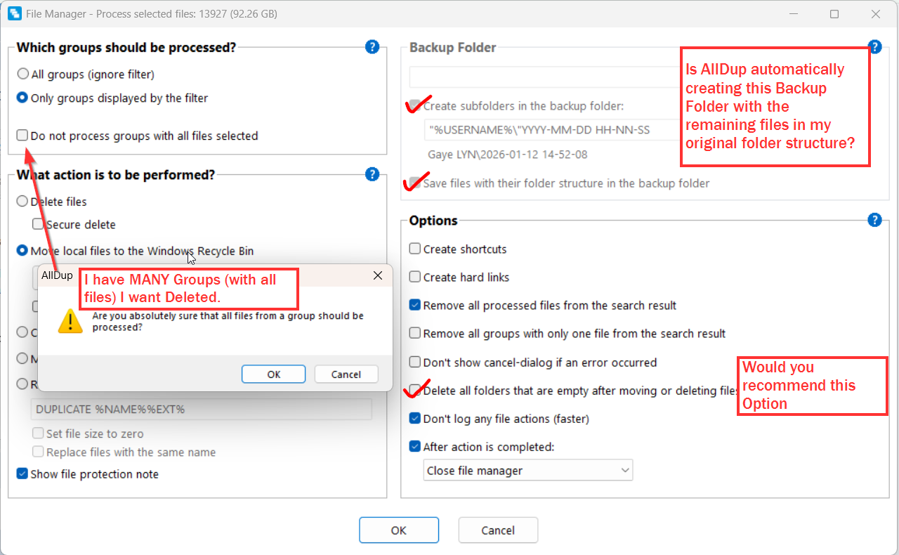 I understood , as you said, that the "search criteria" resulted in 16,586 duplicate files (out of I don't know how many total files are in my Master Folder). It's the 13,923 that confused me. You're explaining that I have selected (checkmarked) 13,923 of the 16,586 for Recycle Bin. So that means that 2,663 files will remain as the Search Results with no duplicates after all groups are processed? Is that correct?