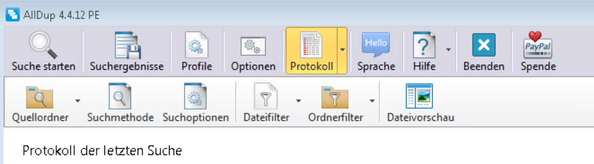 befindet man sich in AllDup im Fenster "Protokoll" und startet eine neue Suche via Button "Suche starten" wird nach dem Beenden des Suchergebnisfensters immer noch das alte Protokoll angezeigt, nicht aber -wie ich erwarten würde- das der letzten Suche.