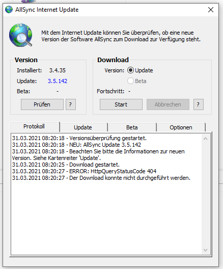 Nach einrichten des neuen Rechners habe ich die Version 3.4.35 installiert und wollte diese nun aktualisieren. AllSync Internet Update gibt mir aber einen Error aus und kann den Download nicht durchführen. Wie kann ich hier Abhilfe schaffen?
