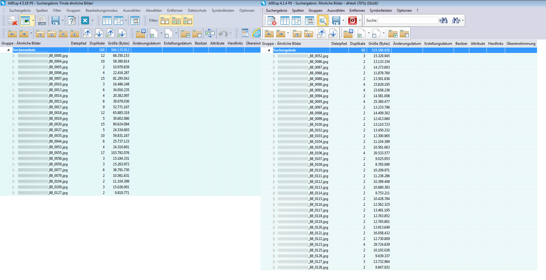Wir haben die Suche nach ähnlichen Bildern mit der alten Version 4.1.4 und der aktuellen Version verglichen und konnten hierbei noch ein paar Optimierungen durchführen, damit das Suchergebnis in der aktuellen Version weniger falsch-positive Duplikate anzeigt und bei bestimmten Dateitypen noch mehr Duplikate findet.