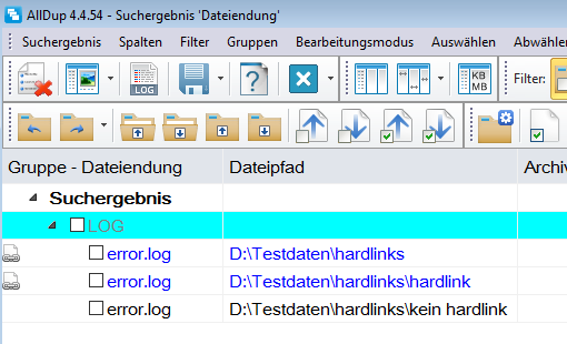 Und jetzt kommts. Benutze ich die alte Version 4.4.30 PE - dann fkt. die Hardlink-Erkennung dort noch, die Dateien sind i.d.R. farblich markiert und wenn ich dort sage "alle Hardlinks aus dem Suchergebnis entfernen" hab ich ploetzlich doch keine Duplikate mehr (im Suchergebnis).